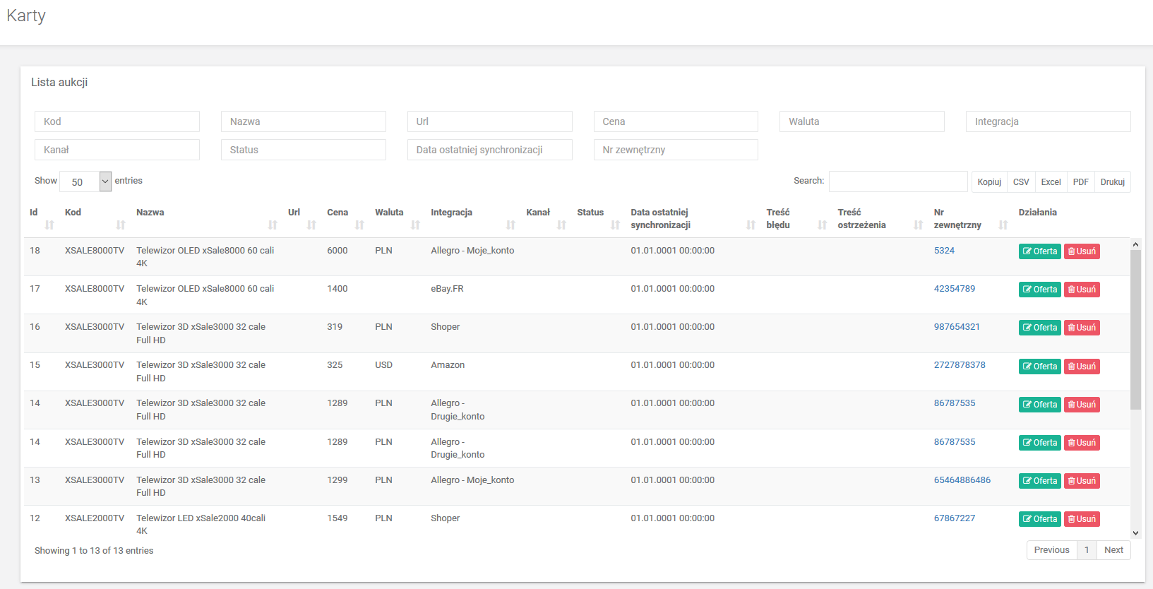 Lista na Kartach, to lista ofert wraz z datą ostatniej synchronizacji na poszczególnych kanałach sprzedaży. Widzimy tu też ewentualne komunikaty błędów zwrócone przez integrowany kanał sprzedaży i możemy przejść na edycję oferty. Listę można sortować według kolumn oraz filtrować po kodzie, nazwie produktu, nazwie integracji, dacie synchronizacji oraz numerze zewnętrznym.
