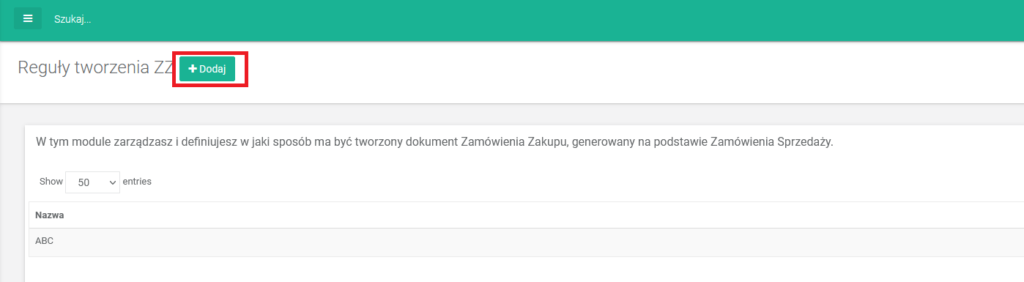 - Reguły dla tworzenia ZZ u dostawcy można określić w menu Konfiguracja -> Zaawansowane -> Reguły tworzenia ZZ. W tym miejscu dodając regułę ustalamy jakie dane z zamówienia w xSale chcemy przekazać do dostawcy i w jaki sposób ma być tworzone zamówienie zakupu.