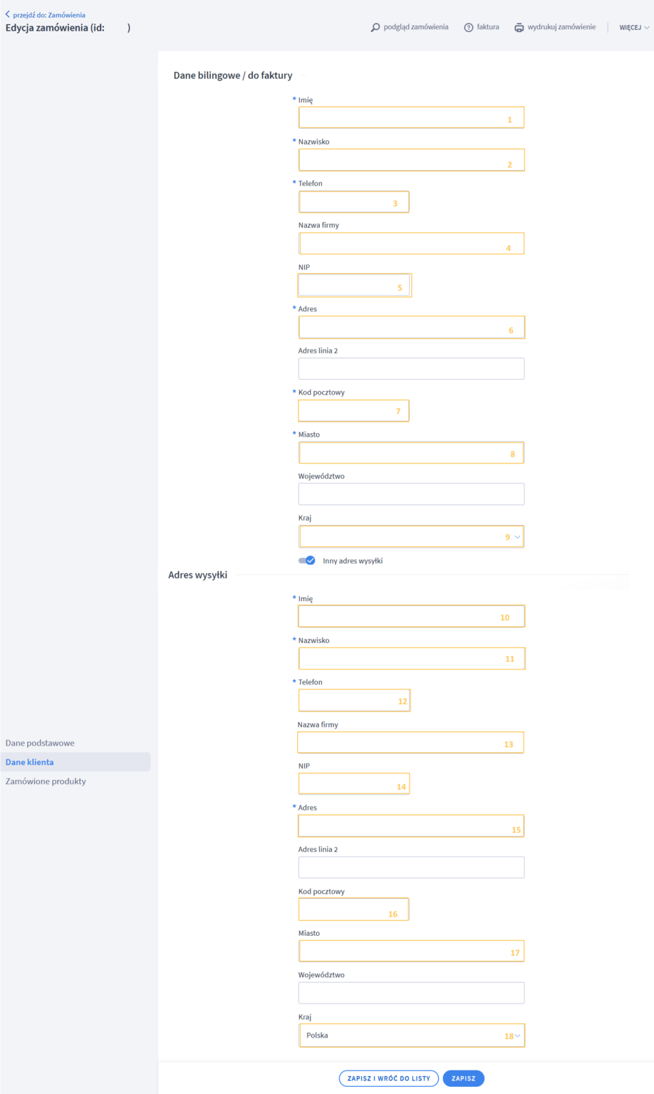 | Edycja zamówienia > Formularz adresu > Kupujący | Nazwa 2 | 19 | Edycja Zamówienia > Dane klienta> Dane do faktury | Imię i nazwisko | 1,2 | Pole Nazwa 2 uzupełniane tylko gdy podano w polu Nazwa podano nazwę firmy. |