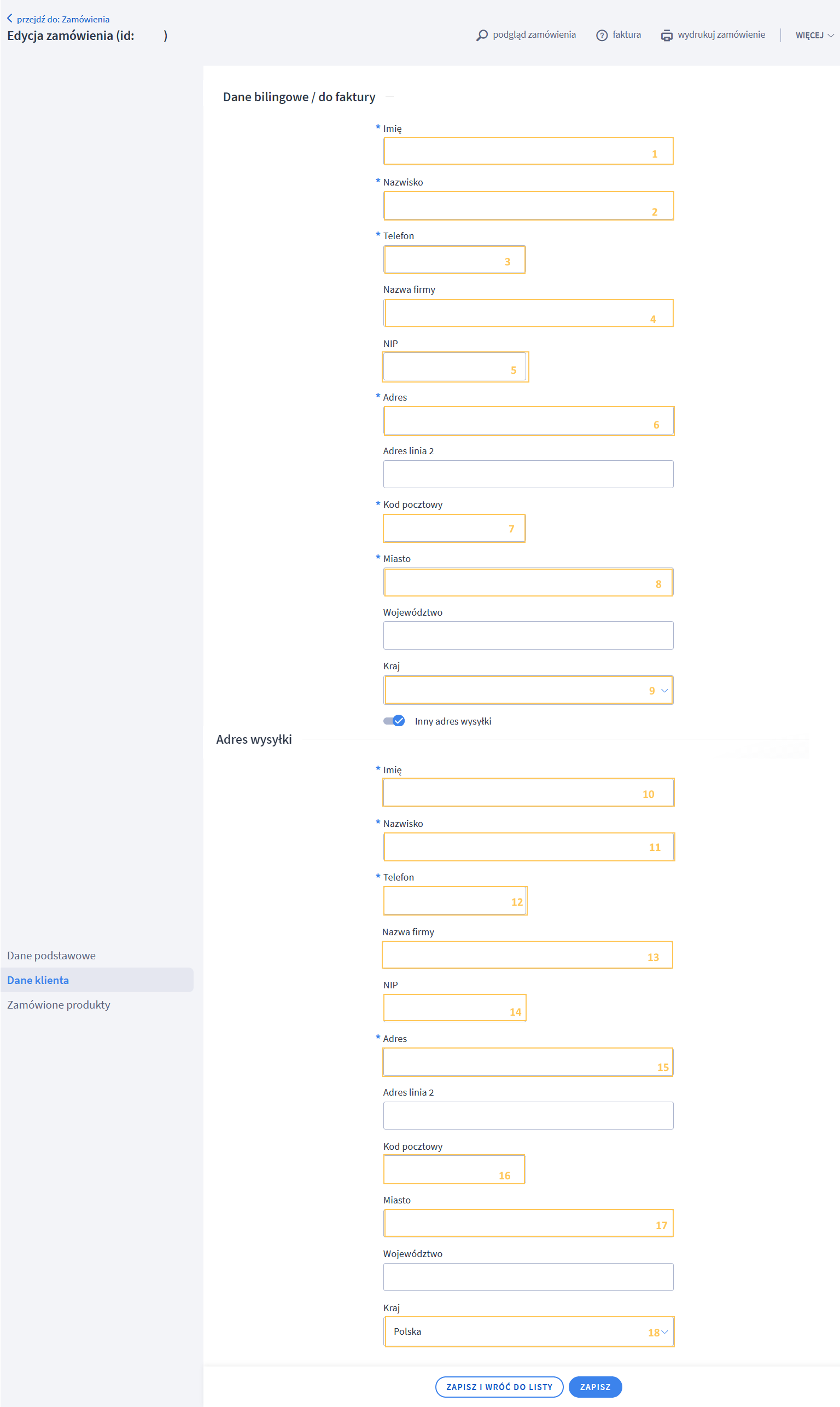 | Edycja zamówienia > Formularz adresu > Odbiorca | Kraj | 17 | Edycja Zamówienia > Dane klienta> Adres wysyłki | Kraj | 18 | |