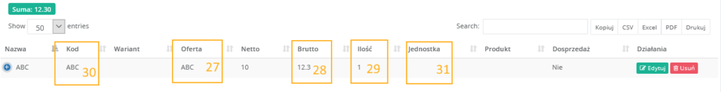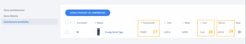 | Edycja zamówienia > Lista przedmiotów zamówienia | Oferta | 27 | Edycja Zamówienia > Dane klienta> Zamówione produkty | Kod produktu | 27 | |
