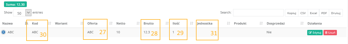 | Edycja zamówienia > Lista przedmiotów zamówienia | Brutto | 28 | Edycja Zamówienia > Dane klienta> Zamówione produkty | Cena | 29 | |