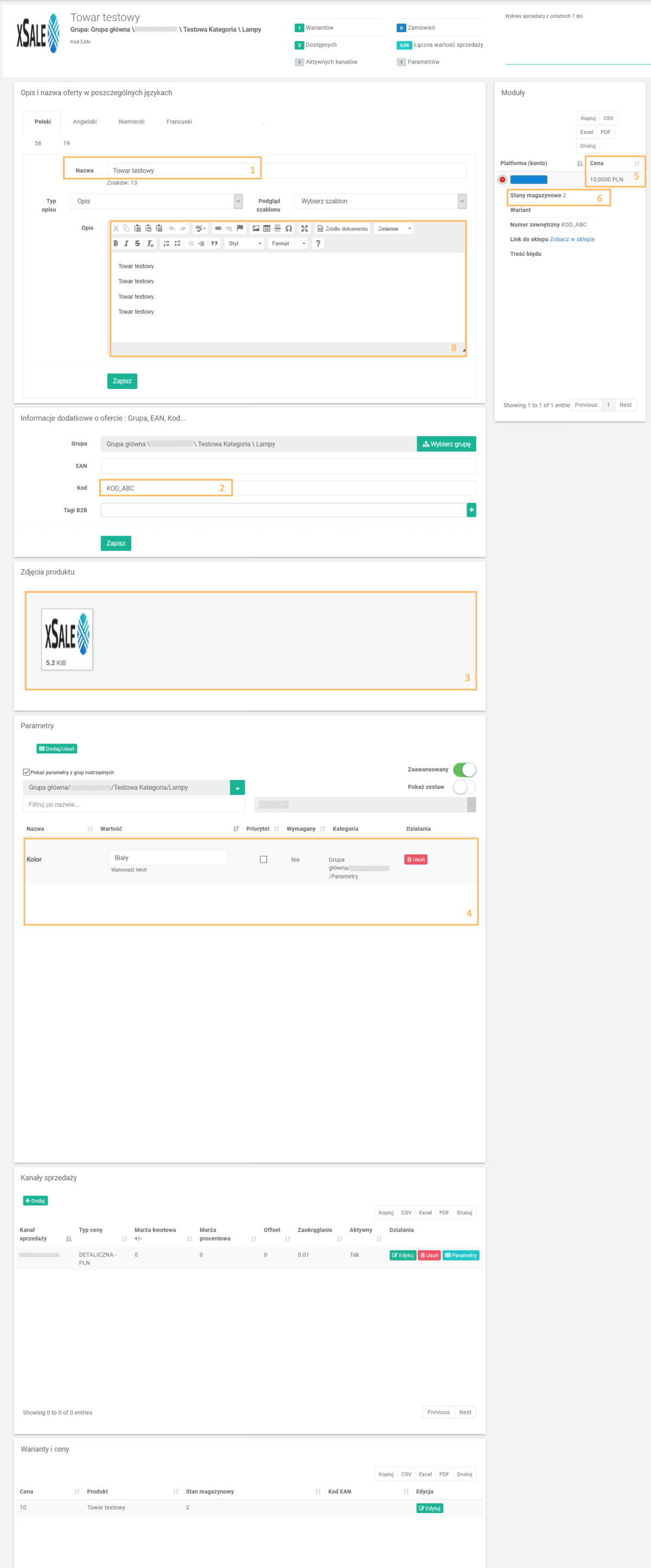 | Oferta -> Edycja -> Parametry | Parametry | 4 | Produkty > Edycja > Atrybuty | Parametr np. Kolor | 12 | |