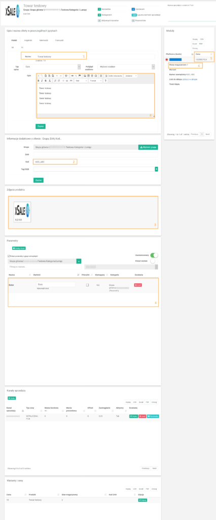 | Oferta -> Edycja -> Moduły – > ClickShop | Cena | 5 | Produkty > Edycja > Dane podstawowe | Cena | 4 | Dla produktu bez wariantów. xSale przesyła tylko jedną wartość cenową dla jednego produktu. |