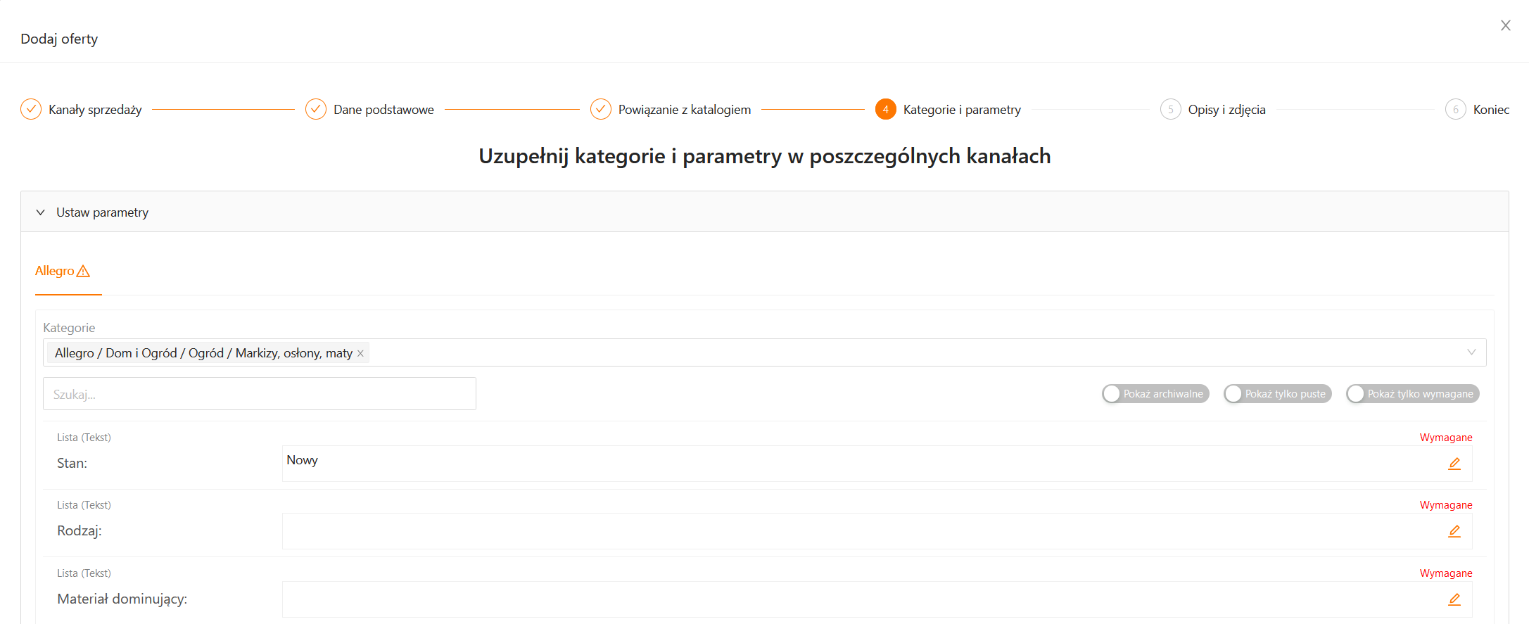 W tym kroku należy uzupełnić wszystkie wymagane pola, takie jak stan, rodzaj, materiał dominujący, marka, kod producenta, długość i szerokość produktu. Listę można przefiltrować na parametry archiwalne, tylko nieuzupełnione lub tylko wymagane. Parametr „Stan” uzupełni się automatycznie wartością „Nowy”.