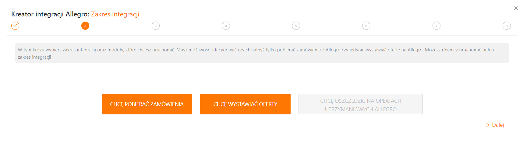 W tym kroku wybierz zakres integracji oraz moduły, które chcesz uruchomić. Masz możliwość zdecydować czy chciałbyś tylko pobierać zamówienia z Allegro czy jedynie wystawiać ofertę na Allegro. Możesz również uruchomić pełen zakres integracji.
