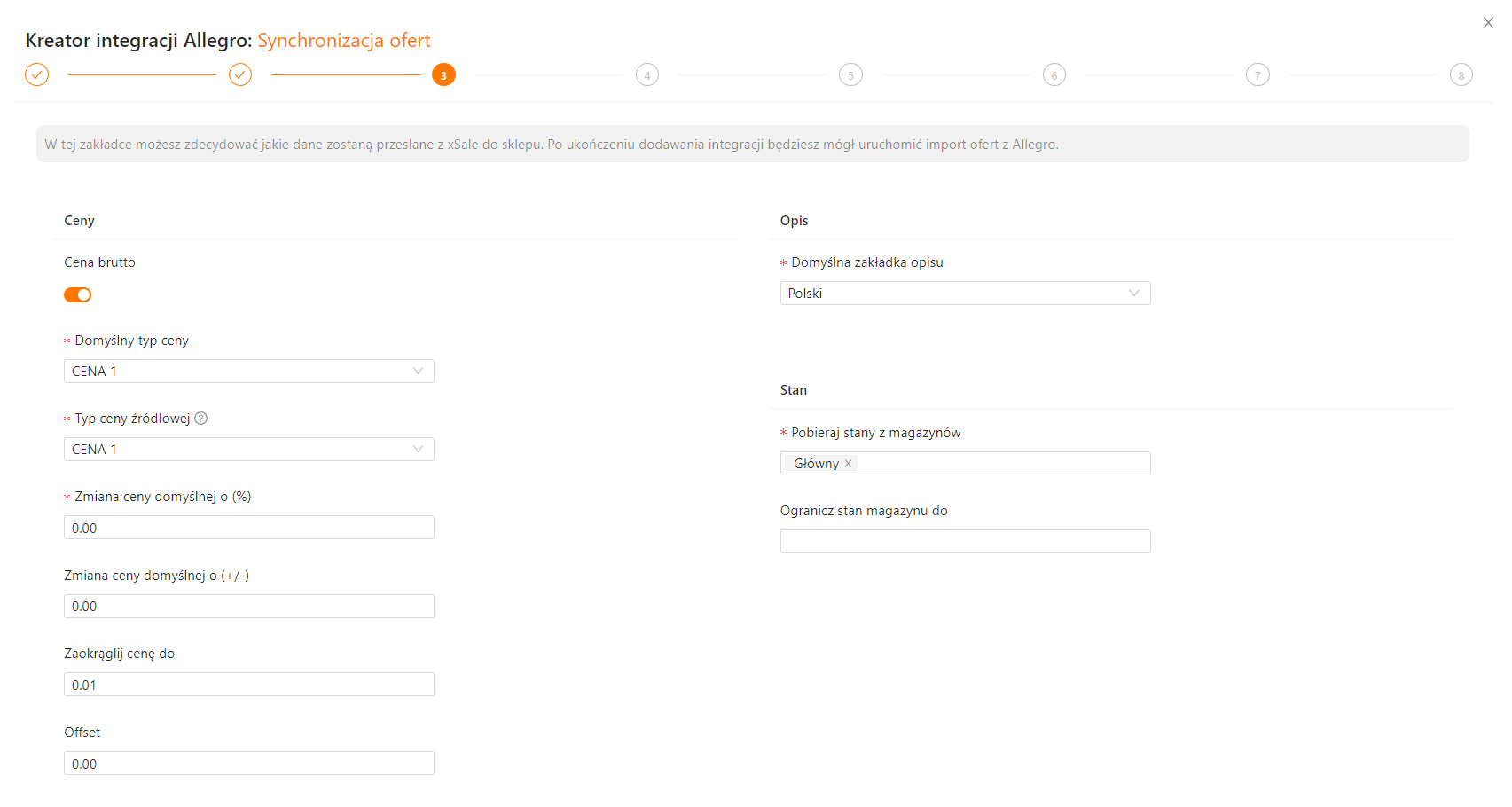 W tym kroku możesz zdecydować jakie dane zostaną przesłane z xSale do Allegro. Po ukończeniu dodawania integracji będziesz mógł uruchomić import ofert z Allegro.
