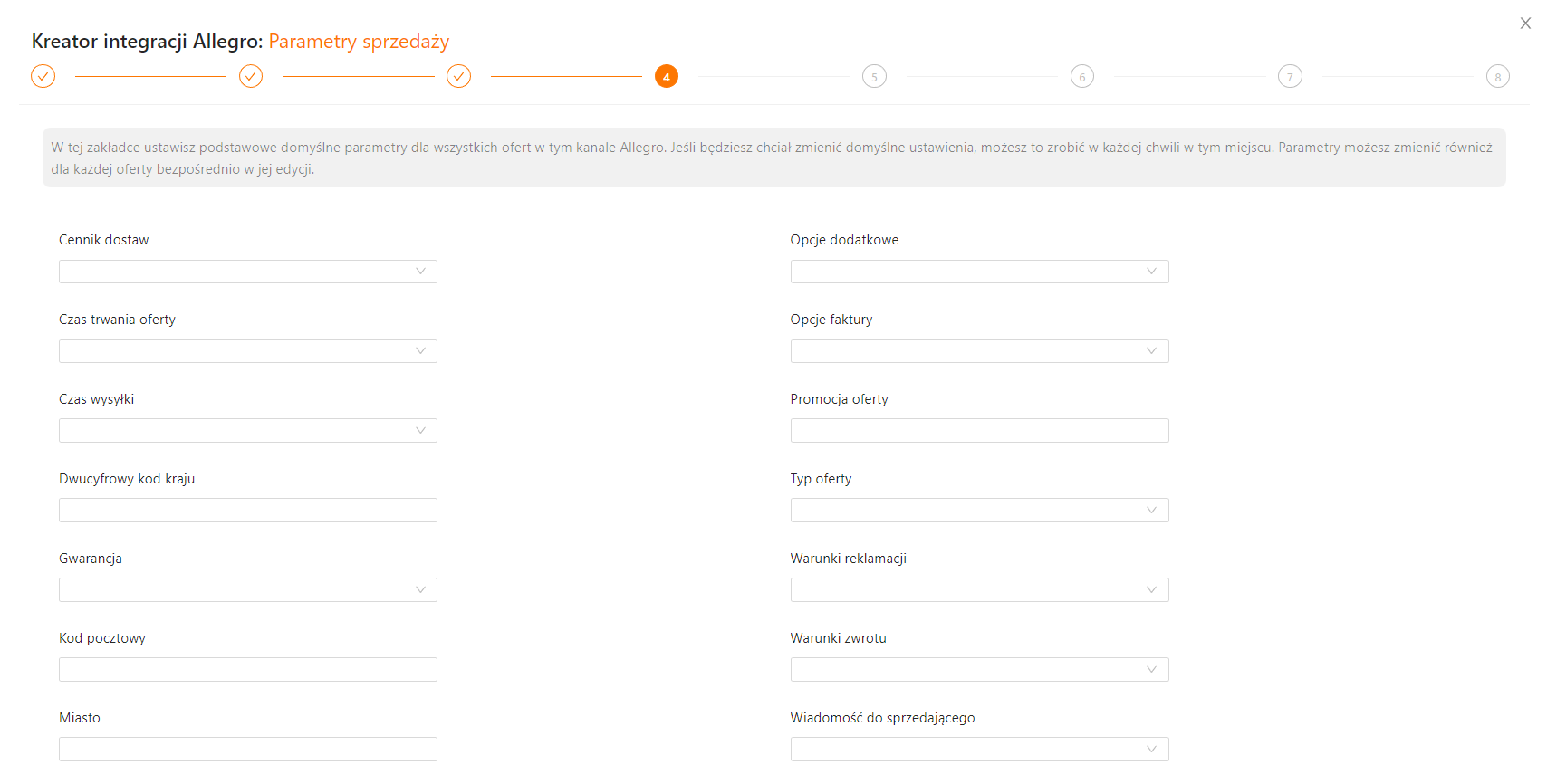 W tej zakładce ustawisz podstawowe domyślne parametry dla wszystkich ofert w tym kanale Allegro. Jeśli będziesz chciał zmienić domyślne ustawienia, możesz to zrobić w każdej chwili w tym miejscu. Parametry możesz zmienić również dla każdej oferty bezpośrednio w jej edycji.