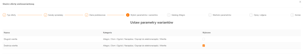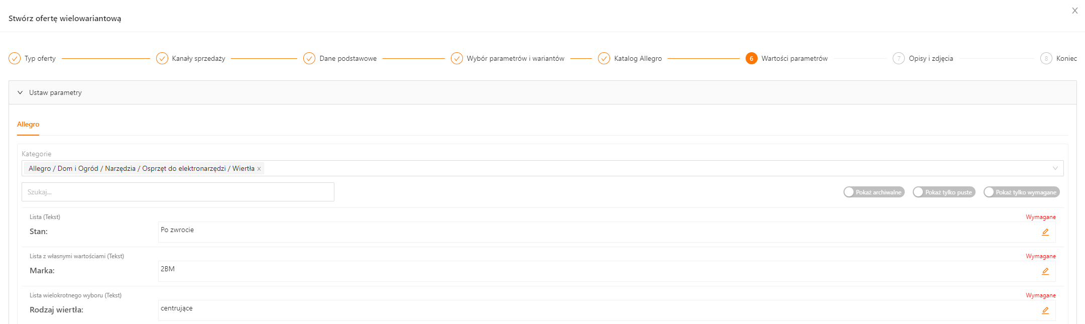 W tym kroku należy wskazać parametry dla wybranej wcześniej kategorii. Listę można przefiltrować na parametry archiwalne, tylko nieuzupełnione lub tylko wymagane. Parametr „Stan” uzupełni się automatycznie wartością „Nowy”.