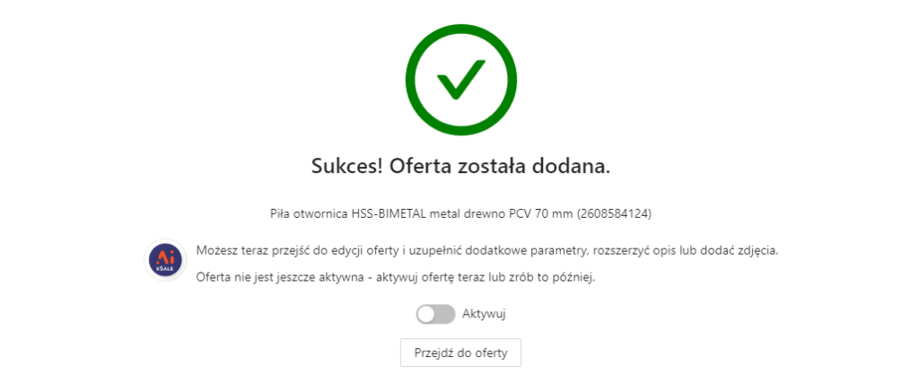 Na tym etapie otrzymujemy informację czy nasza oferta została utworzona z sukcesem. Możemy również od razu włączyć jej aktywność. Przełączenie aktywności spowoduje, że oferta zostanie od razu opublikowana w Allegro. Tą czynność możemy wykonać również później używając operacji seryjnej lub przełączając aktywność bezpośrednio w ofercie.