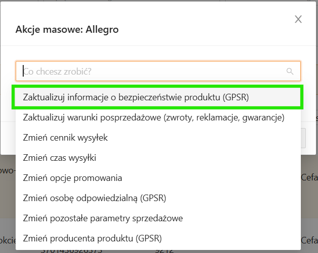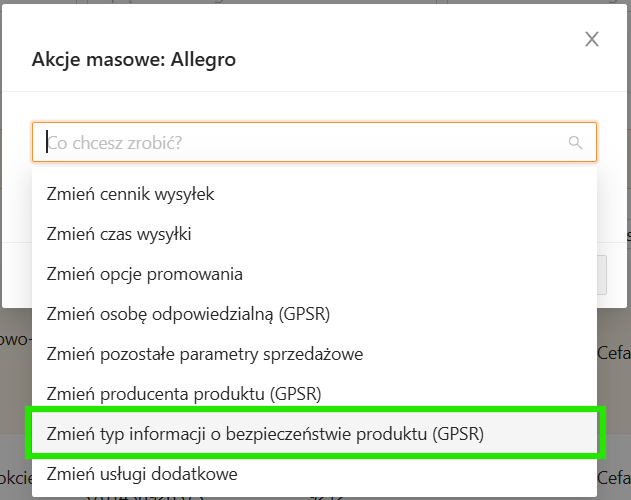 Możesz zaktualizować treść (tekst) informacji o bezpieczeństwie produktu, wykorzystując operacje seryjne. Przejdź na listę ofert, zaznacz wybrane oferty i wybierz Operacje seryjne – Akcje masowe Allegro (zob. zrzut ekranu w poprzednim punkcie).