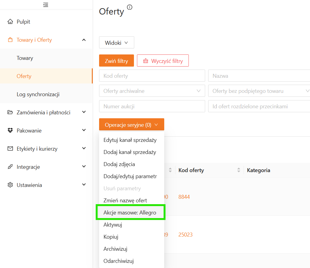 Możesz zaktualizować typ informacji o bezpieczeństwie produktu, wykorzystując operacje seryjne. Przejdź na listę ofert, zaznacz wybrane oferty i wybierz Operacje seryjne – Akcje masowe Allegro.