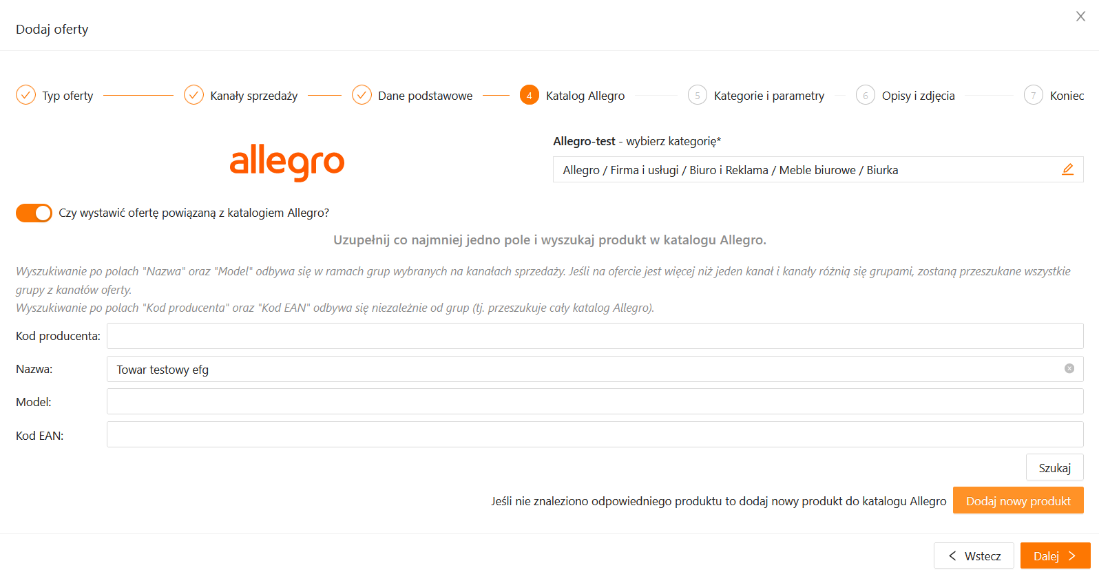 Po podaniu Kodu produktu lub Kodu EAN, Nazwy lub Modelu wyszukujemy odpowiedni produkt z katalogu i wybieramy produkt. Następnie parametry produktu zostają zaczytane z katalogu i oferta zostaje wystawiona. Parametr „Stan” uzupełni się automatycznie wartością „Nowy”.