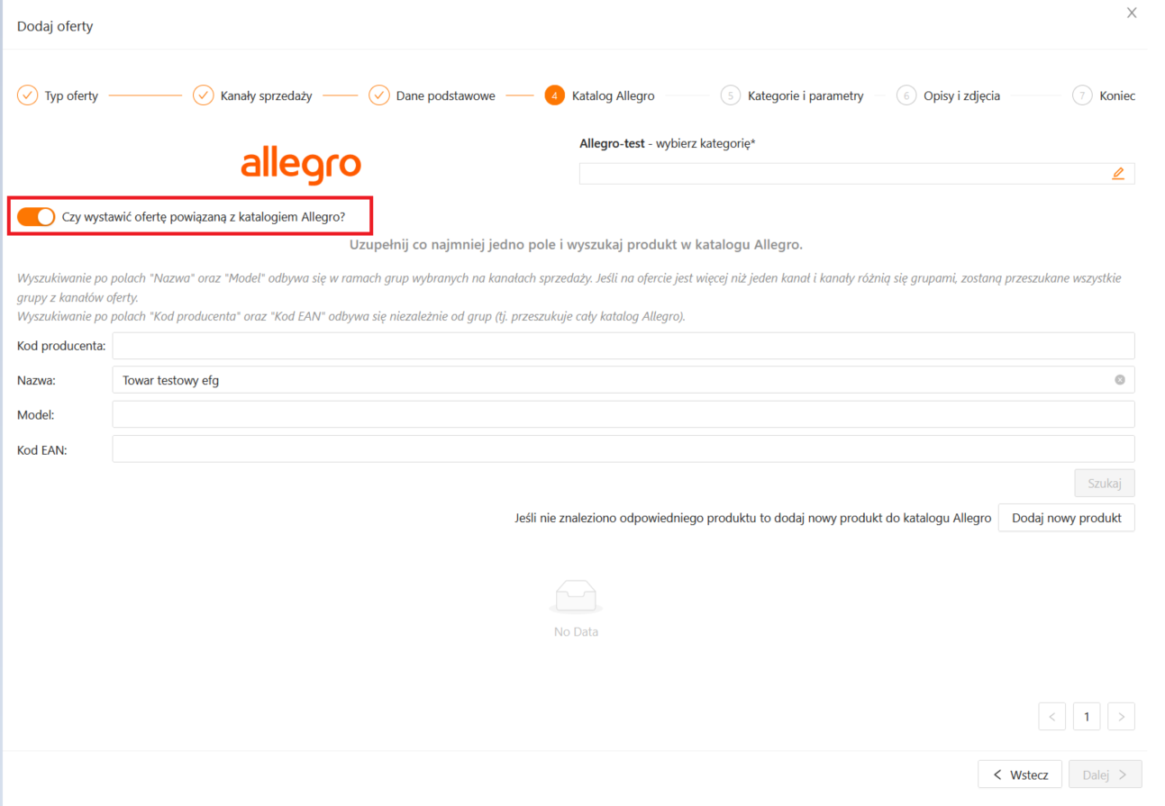 W kreatorze tworzenia oferty oznaczamy opcję „Czy wystawić ofertę powiązaną z katalogiem Allegro?”.