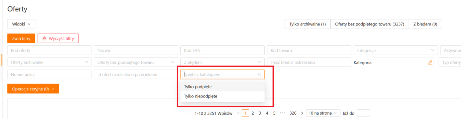 Na liście ofert został dodany nowy filtr, który pozwala odnaleźć oferty, które nie są spięte z katalogiem Allegro.
