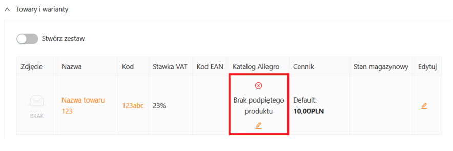 • Aukcja ma już podpięty produkt w Allegro.