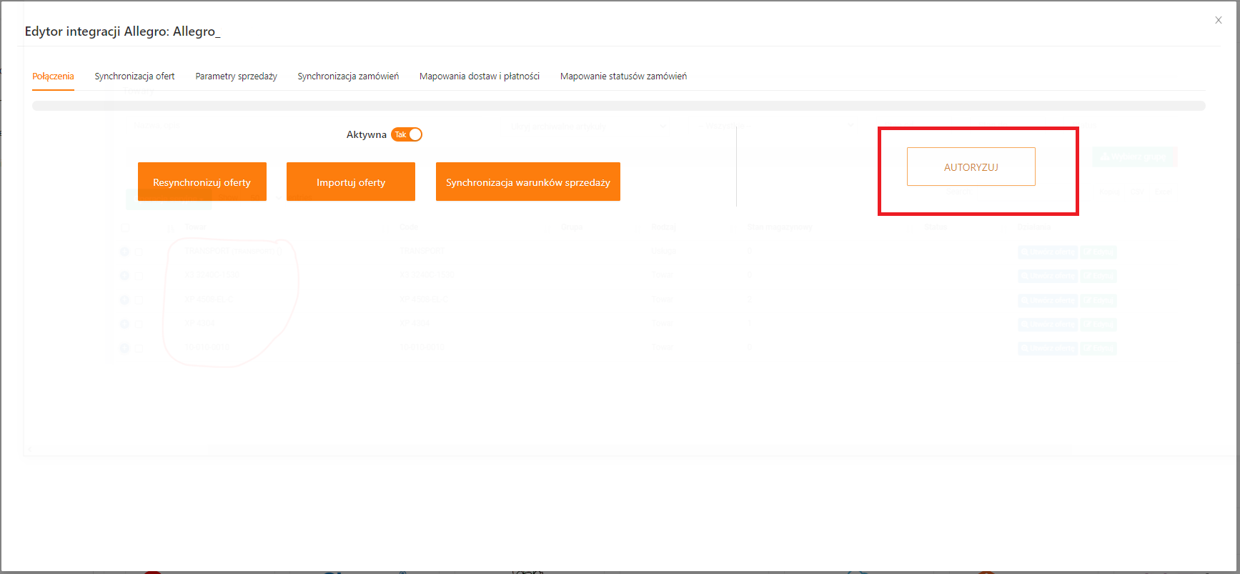 Jeżeli token stracił ważność należy przejść autoryzację klikając przycisk AUTORYZUJ i logując się do konta Allegro.