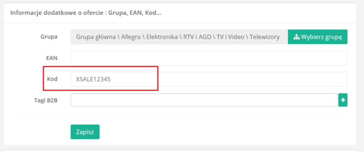 Uzupełnienie kodów na ofertach. W przypadku oferty oznaczonej jako zestaw pole Kod jest obowiązkowe.