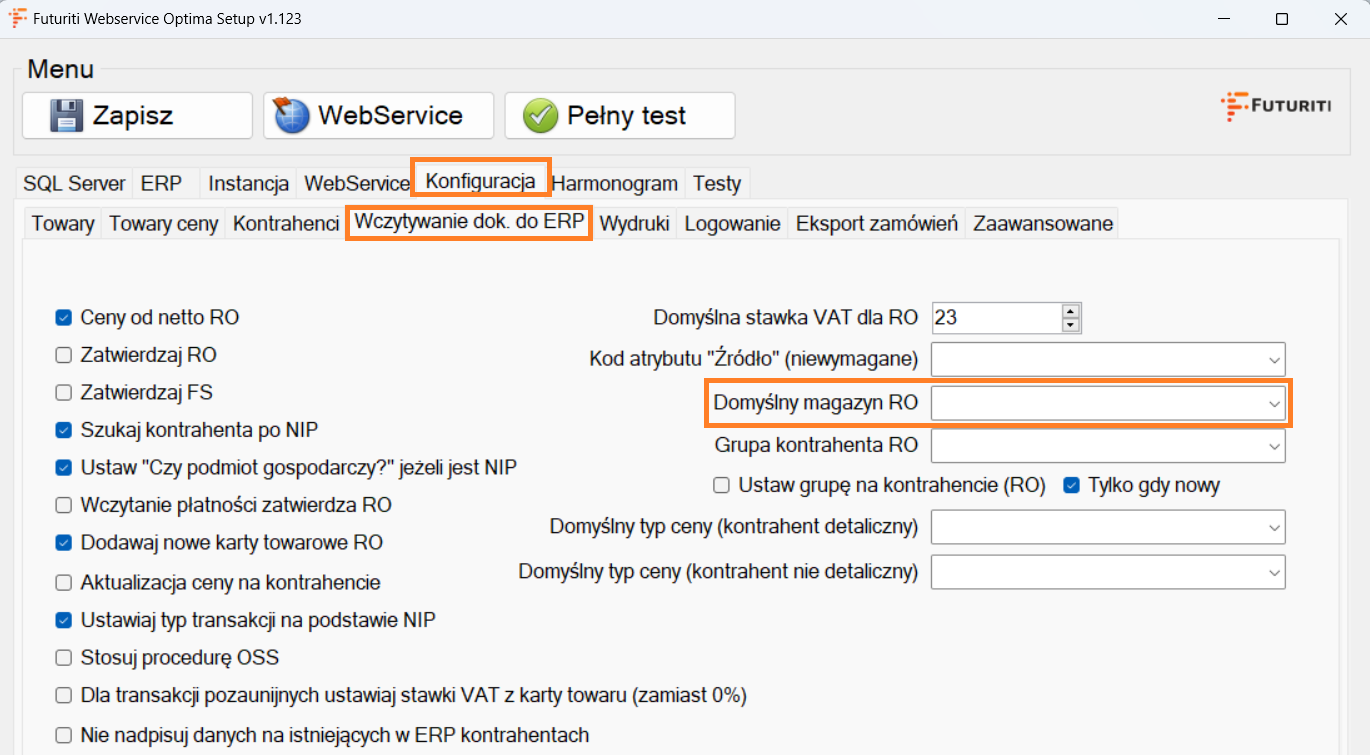 Po włączeniu WebService, przejdź do zakładki Konfiguracja oraz Wczytywanie dok. do ERP.