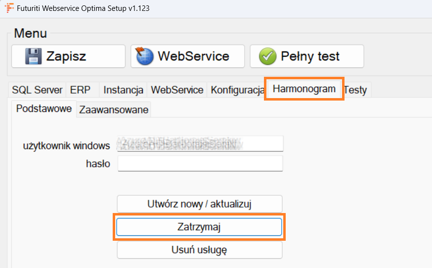 Aby wprowadzone zmiany zaczęły obowiązywać, przejdź do zakładki „Harmonogram” i zrestartuj usługę WebService, korzystając z przycisku Zatrzymaj, odśwież status SOAP a następnie Uruchom.