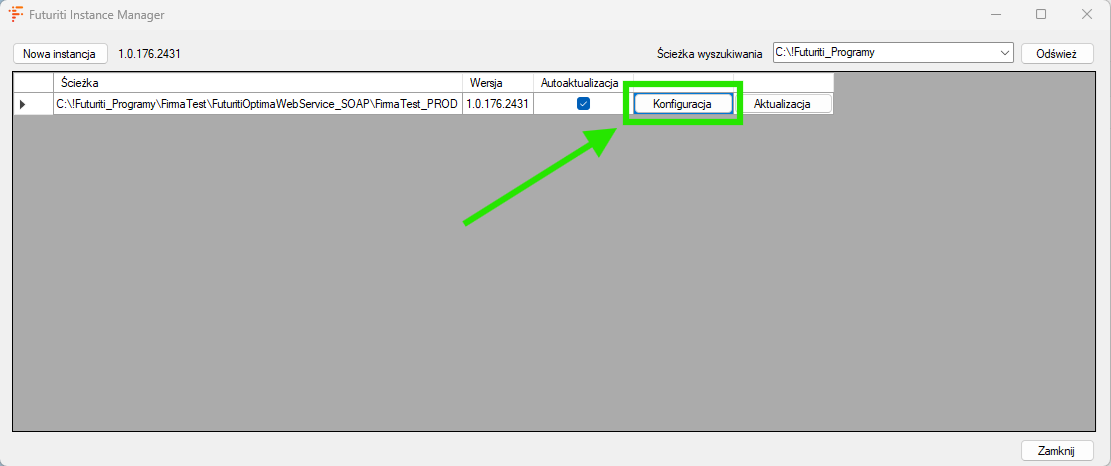 - Kliknij przycisk Konfiguracja przy ścieżce z lokalizacją Futuriti WebService’u.
