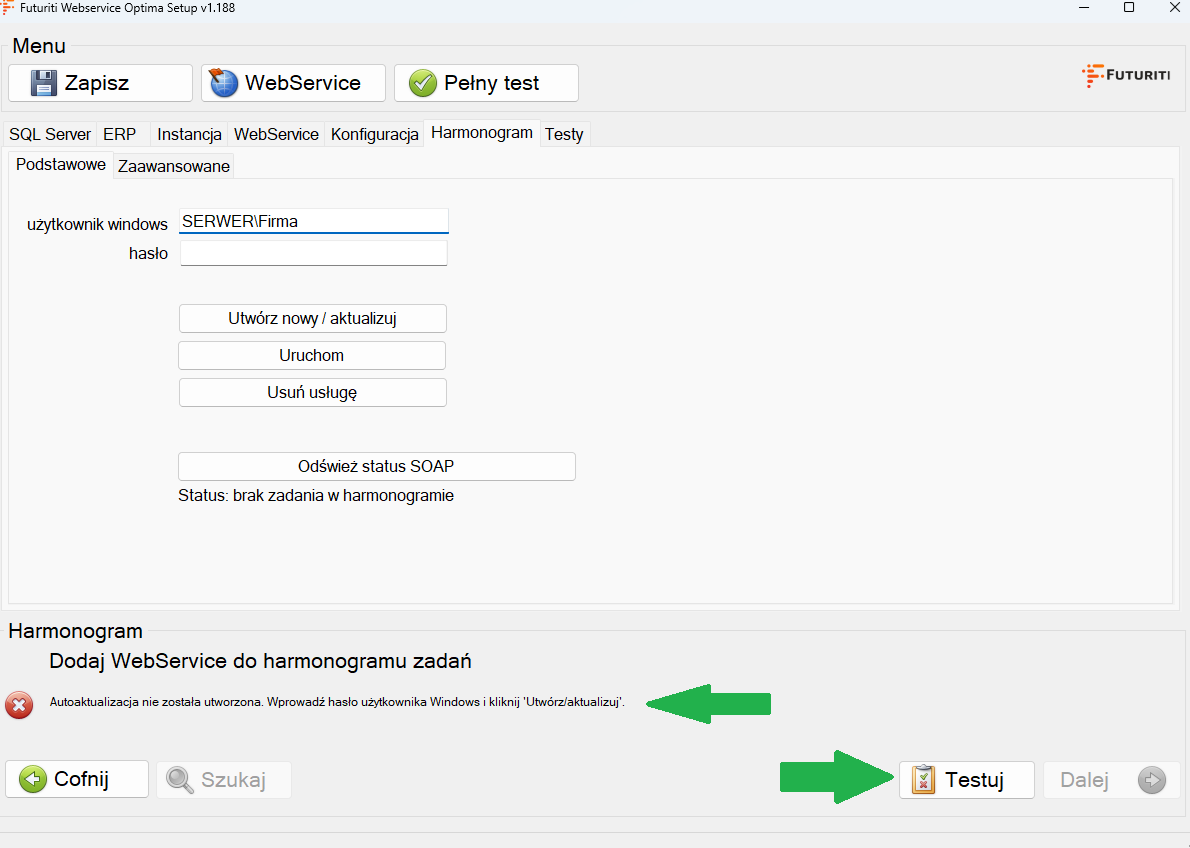 W zakładce „Harmonogram” po naciśnięciu przycisku „Testuj” zostanie usunięta usługa i wyświetli się komunikat „Autoaktualizacja nie została utworzona. Wprowadź hasło użytkownika Windows i kliknij 'Utwórz/aktualizuj'”. Oznacza to że usługa została usunięta i trzeba ją dodać od nowa.
