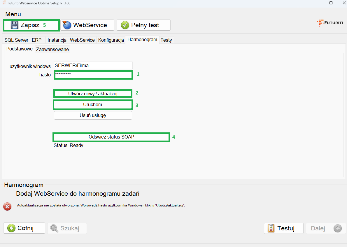 - W tej samej zakładce [1] wpisz hasło użytkownika i [2] kliknij Utwórz nowy / aktualizuj. Następnie [3] Uruchom usługę i [4] Odśwież status SOAP aby sprawdzić czy usługa się uruchomiła, a na końcu [5] zapisz zmiany