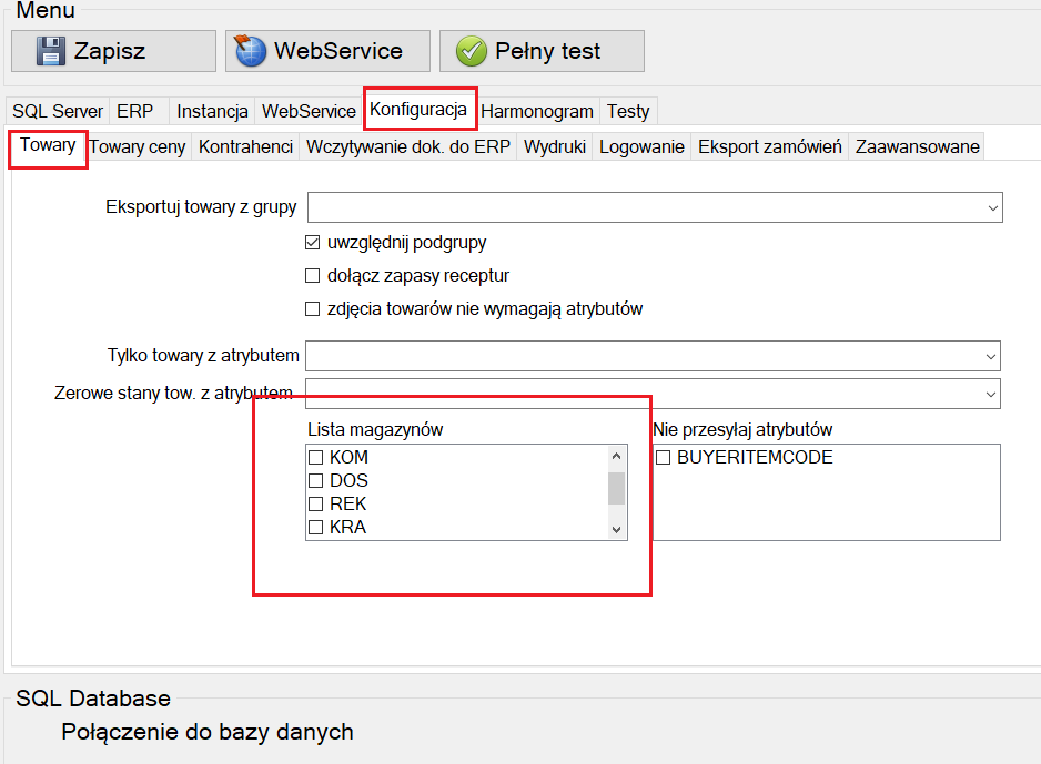 Uwaga! Po zmianie w konfiguracji magazynów należy zapisać zmiany i zrestartować WebService. Czyli przejść do zakładki „Harmonogram”. Nacisnąć przycisk „Zatrzymaj”, następnie „Odśwież status SOAP” i Uruchom.