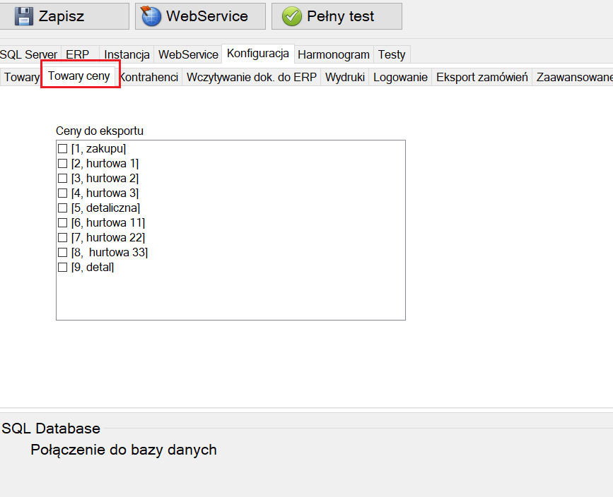 • Na zakładce Towary ceny można zaznaczyć jakie typy cen mają zostać zaimportowane do xSale.