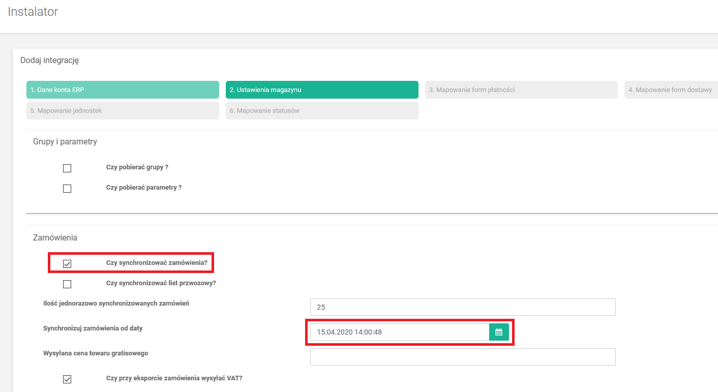 - W sekcji Zamówienia zaznacz flagę Czy synchronizować zamówienia?