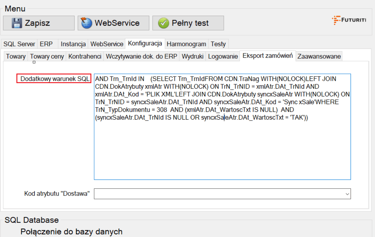 - Warunek SQL podajemy w konfiguracji Webservice na zakładce Eksport zamówień, w polu Dodatkowy warunek SQL: