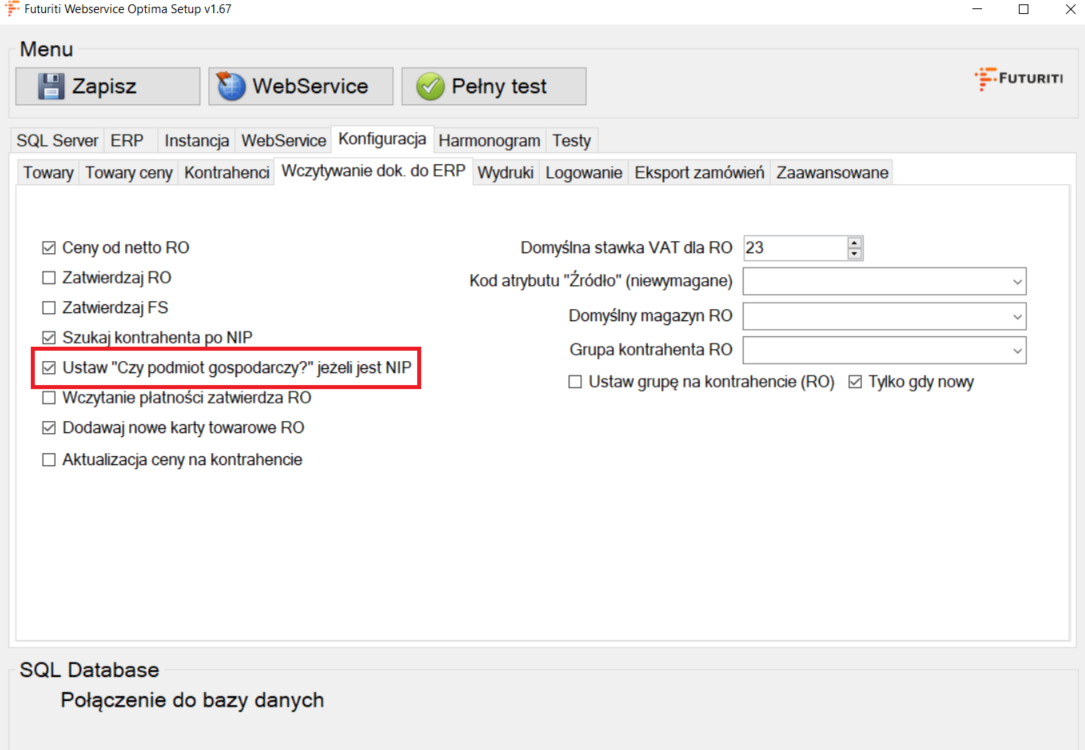 W konfiguracji Webservice do Optimy można wyłączyć automatyczne wybieranie tej flagi odznaczając opcję Ustaw „Czy podmiot gospodarczy?” jeżeli jest NIP.