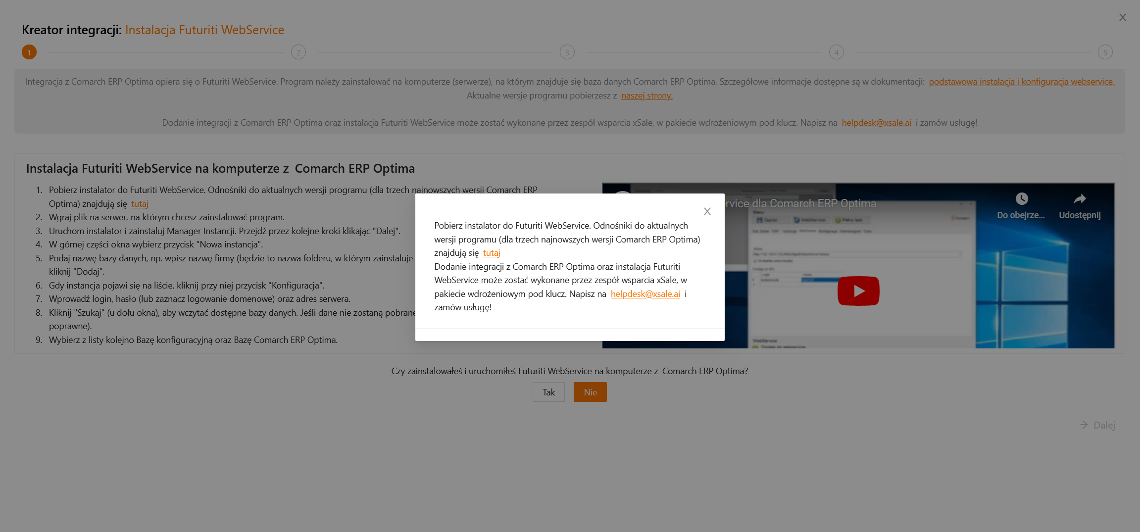 W dolnej sekcji kreatora wyświetla się pytanie: „Czy zainstalowałeś i uruchomiłeś Futuriti WebService na komputerze z Comarch ERP Optima?”. Jeżeli wybierzesz opcję „Nie”, system wyświetli komunikat zawierający link do pobrania instalatora programu, który rozpocznie instalację oprogramowania na komputerze z Comarch ERP Optima.