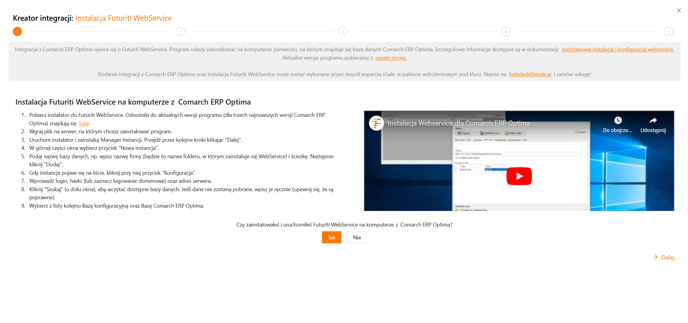 Jeśli program Futuriti WebService masz zainstalowany na komputerze, wybierz opcję „Tak” i przejdź do następnego kroku.