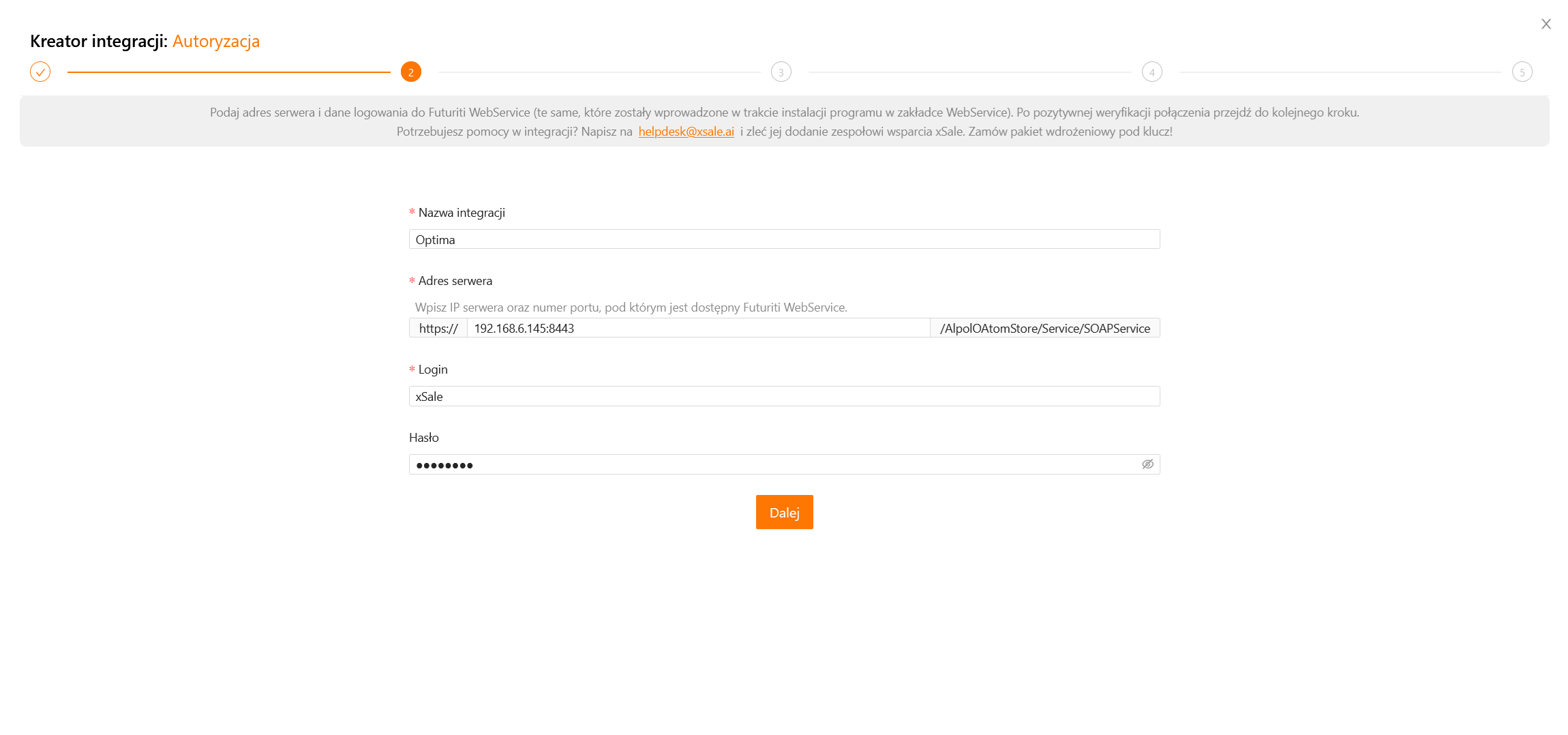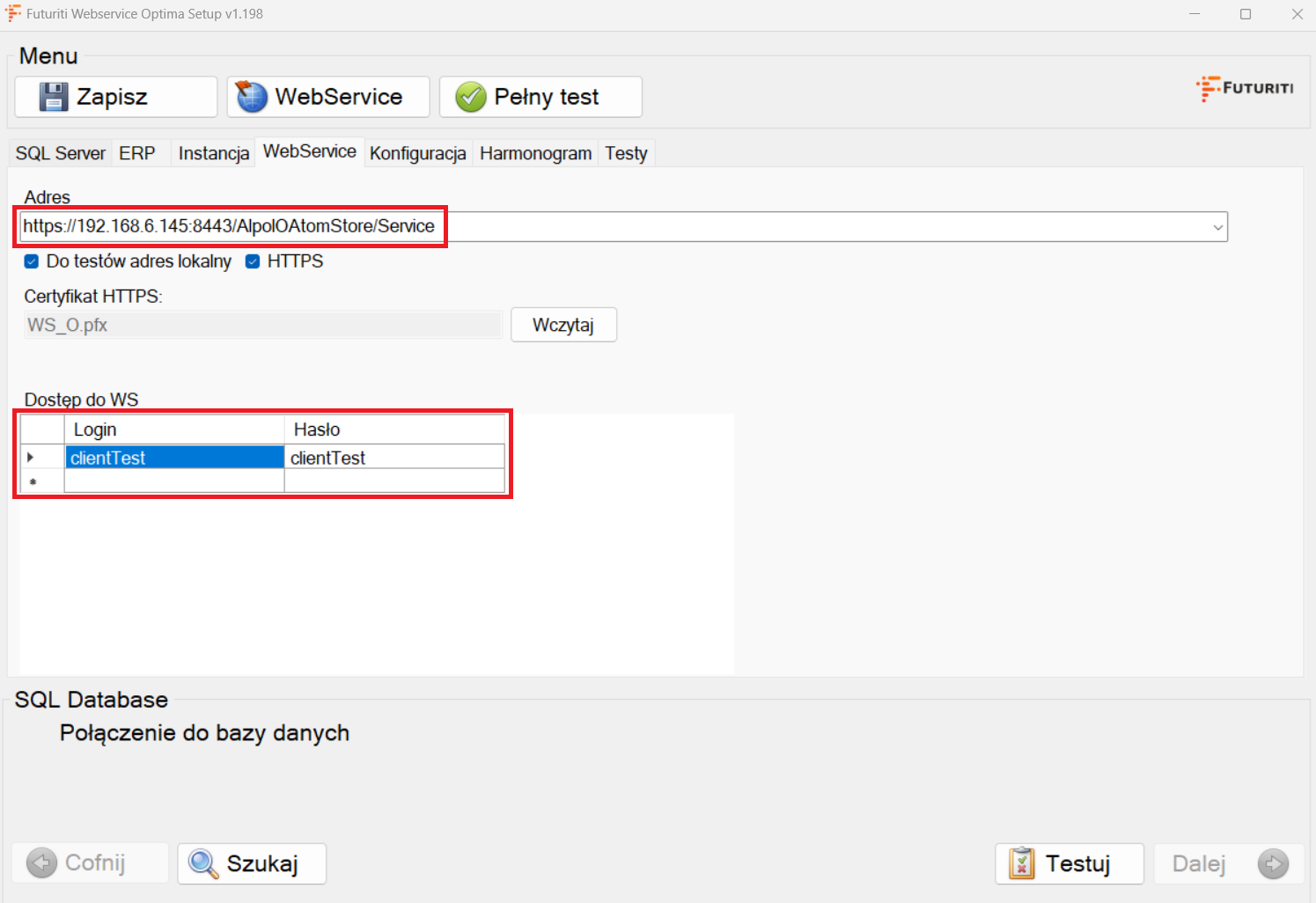 Adres IP serwera, login i hasło znajdziesz w programie Futuriti WebService Optima, w zakładce WebService: