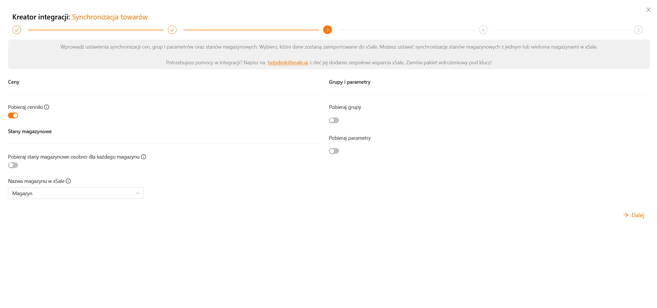 W trzecim kroku kreatora wskaż czy chcesz pobierać następujące pozycje: