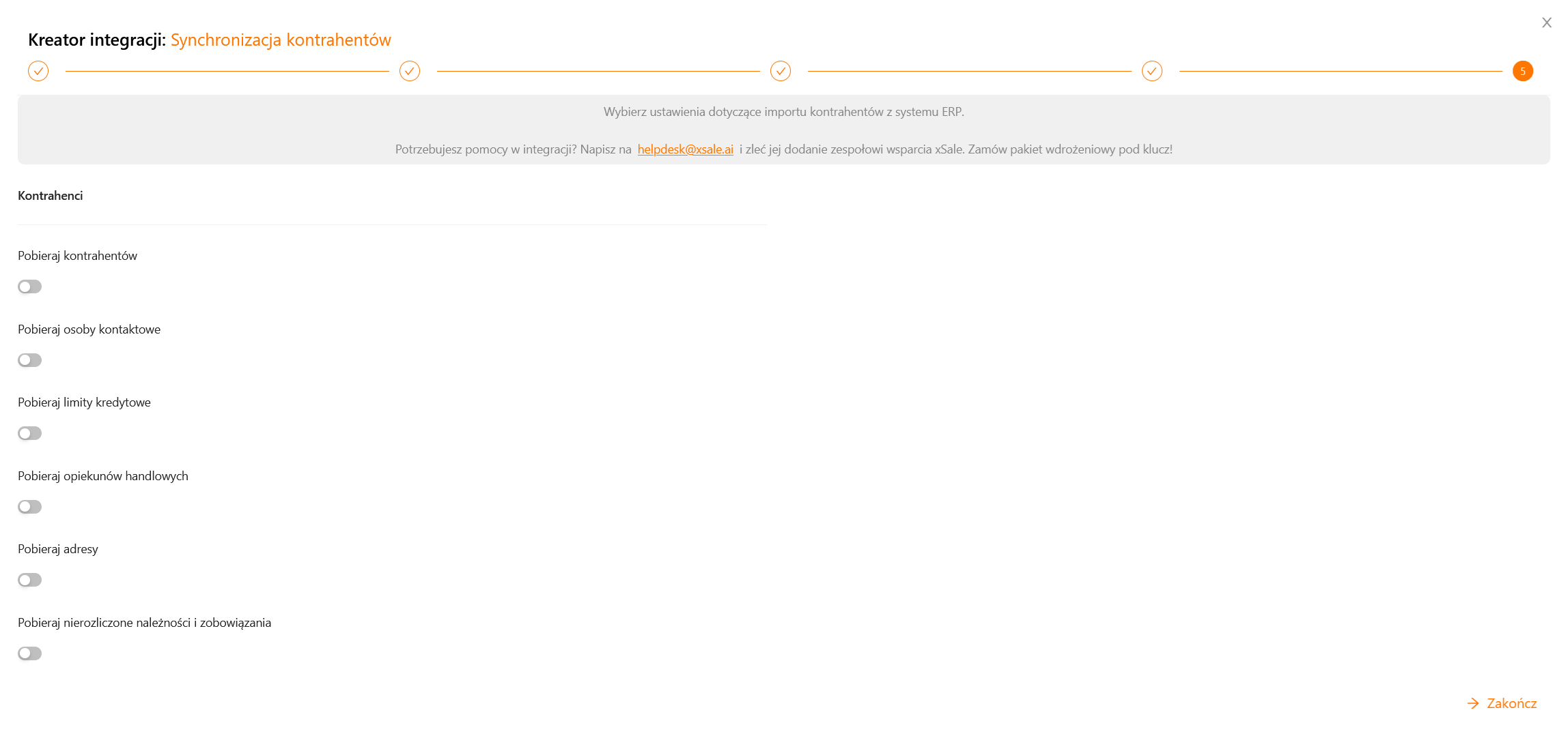 W ostatnim kroku kreatora skonfigurujesz ustawienia synchronizacji kontrahentów. Możesz ustalić jakie dane kontrahentów pobierzesz z Optimy do xSale. Jeśli nie potrzebujesz specyficznych ustawień synchronizacji danych kontrahentów, pozostaw tę sekcję z ustawieniami domyślnymi, aby ograniczyć transfer danych, co wpłynie na szybsze działanie systemu.