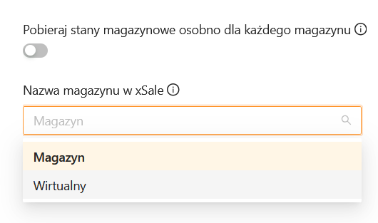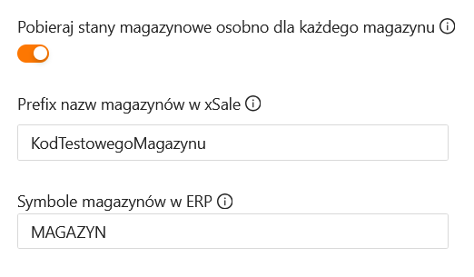 W przypadku, gdy chcesz pobierać stany magazynowe indywidualnie dla każdego magazynu, w pierwszym polu podaj kod magazynu w xSale, a w drugim polu wypisz po średniku, symbole wszystkich magazynów w ERP, których stany chcesz pobierać.