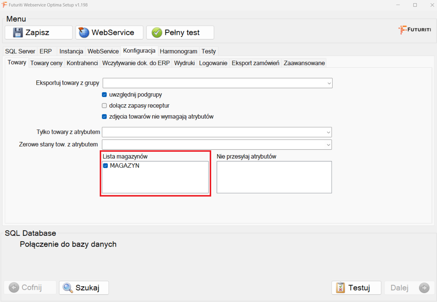 Magazyny z ERP znajdziesz w Futuriti WebService, w zakładce Konfiguracja, sekcja Towary: