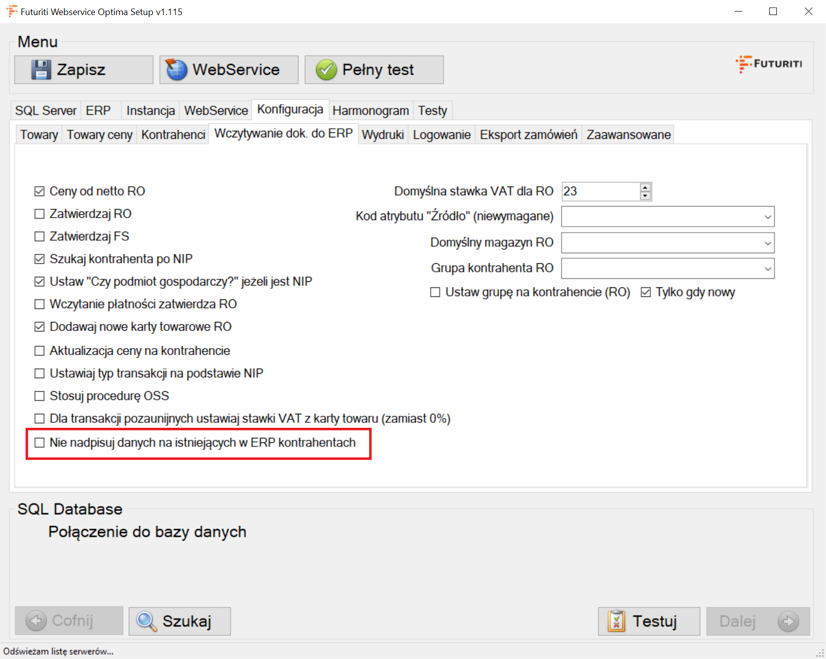 W celu włączenia tej opcji przechodzimy do konfiguracji Webservice do zakładki Wczytywanie dok. do ERP. Zaznaczamy flagę przy pozycji „Nie nadpisuj danych na istniejących w ERP kontrahentach”.