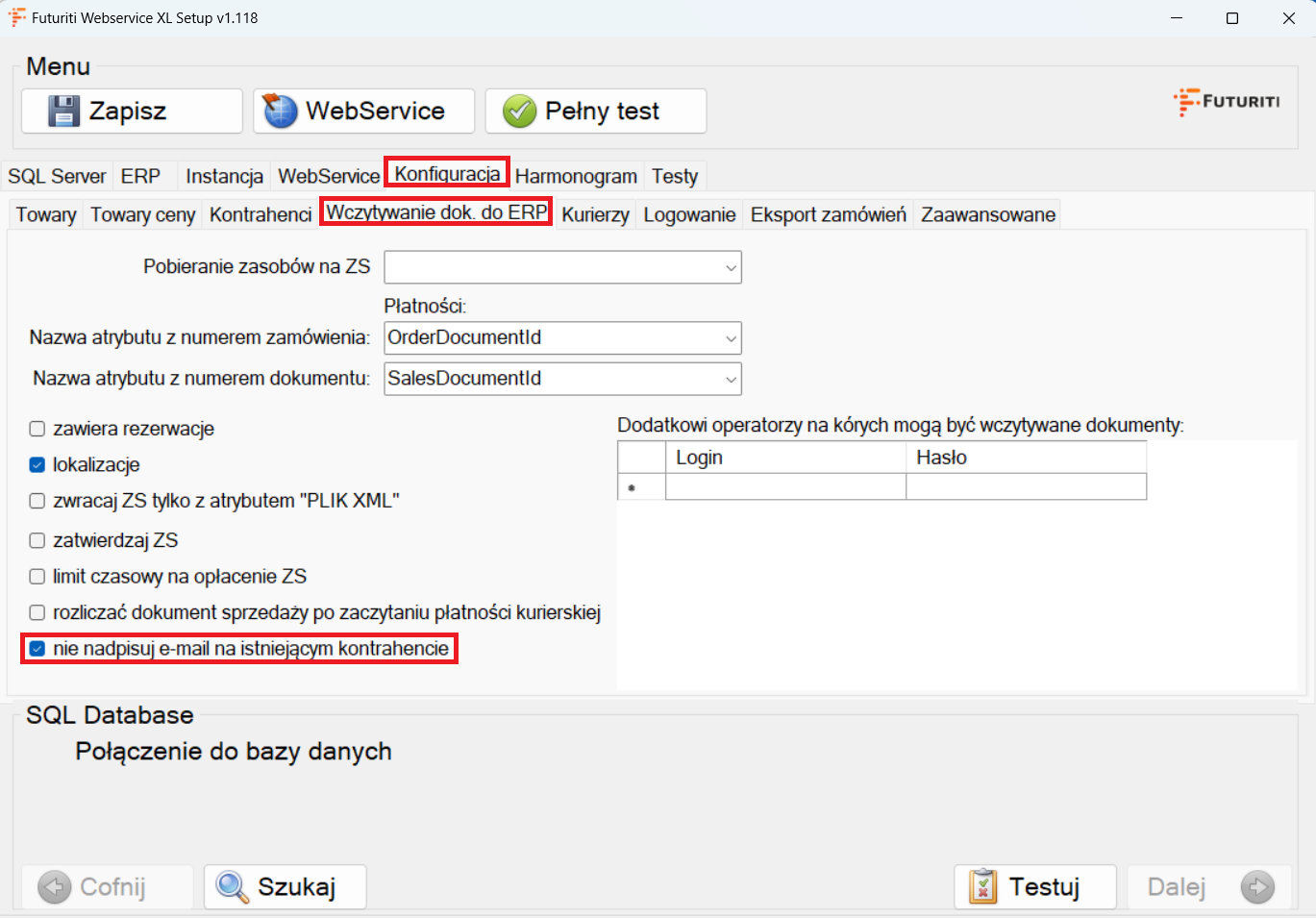 2. Po włączeniu WebService XL, przejdź do zakładki Konfiguracja oraz Wczytywanie dok. do ERP. Zaznaczamy flagę nie nadpisuj e-mail na istniejącym kontrahencie.