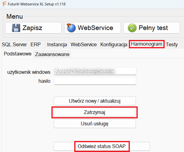4. Aby wprowadzone zmiany zaczęły obowiązywać, przejdź do zakładki „Harmonogram” i zrestartuj usługę WebService XL, korzystając z przycisku Zatrzymaj, odśwież status SOAP a następnie Uruchom.