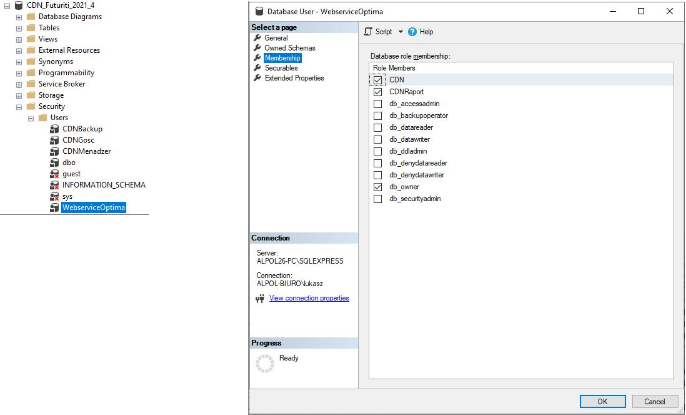 USE [CDN_KNF_Konfiguracja_2021_4]ALTER ROLE [CDN] ADD MEMBER [WebserviceOptima];