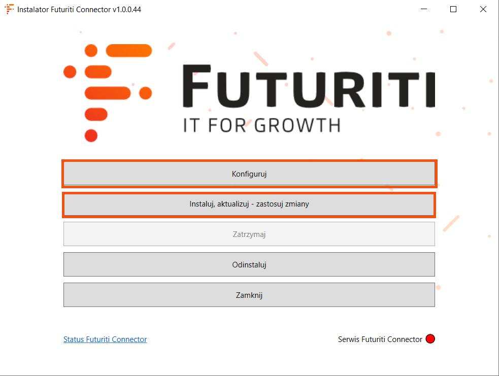 - Otwórz konfigurator Connector w C:\!Futuriti_Programy\FuturitiErpConnectorInstaller_Update_(wersja)\FuturitiErpConnectorInstaller.exe