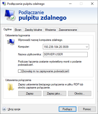 Jest to preferowana metoda dostępu. Pozwala w późniejszym okresie na znacznie szybsze serwisowanie łącznika oraz realizowanie Waszych zleceń. Możesz samodzielnie skonfigurować połączenie z RDP lub poprosić o to swojego informatyka. Link do pomocy Microsoftu jak uruchomić połączenie.