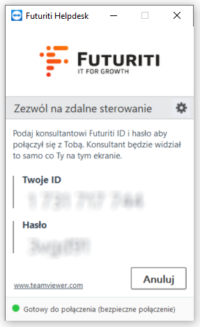 Jeśli połączenie przez RDP jest niemożliwe to skorzystaj z naszego firmowego TeamViewer. Jego użytkowanie jest darmowe. Trzeba jednak pamiętać, że każda zmiana lub sprawdzenie konfiguracji oraz aktualizacja WebService będzie wymagać podania danych do logowania. Co w praktyce wydłuża przyszłą pomoc.