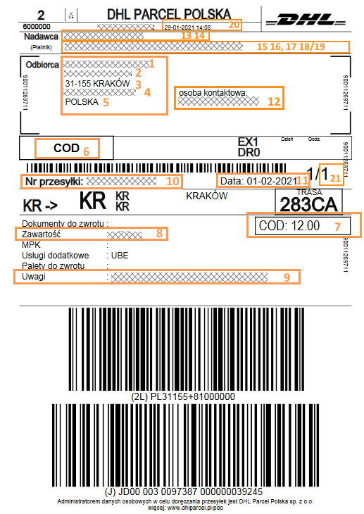 Poniższa tabela prezentuje zakres przesyłanych między xSale a DHL danych na przykładzie wygenerowanej etykiety.