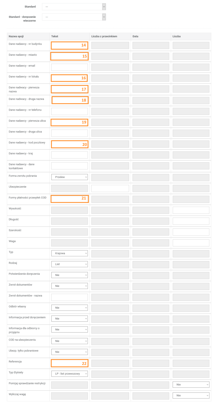 | ShipmentTask > Edycja DHL | Dane nadawcy – nr lokalu | 16 | Nadawca (Płatnik) | Nadawca adres | 19 | |