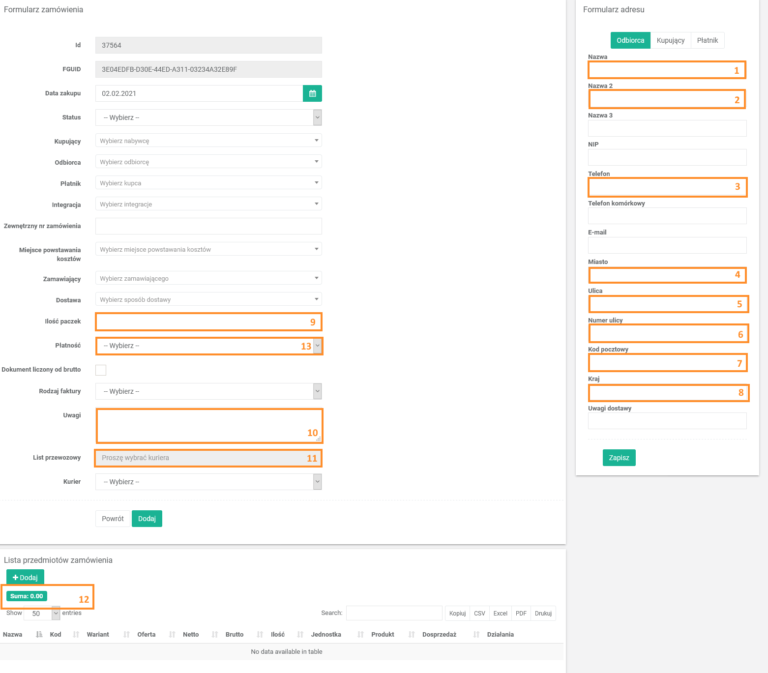 | Formularz zamówienia > Lista przedmiotów | Suma | 12 | COD – kwota | 7 | ||
