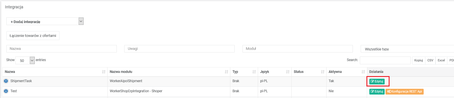 • W tym celu należy wybrać Konfiguracja –> Integracje i edytować integrację ShipmentTask.